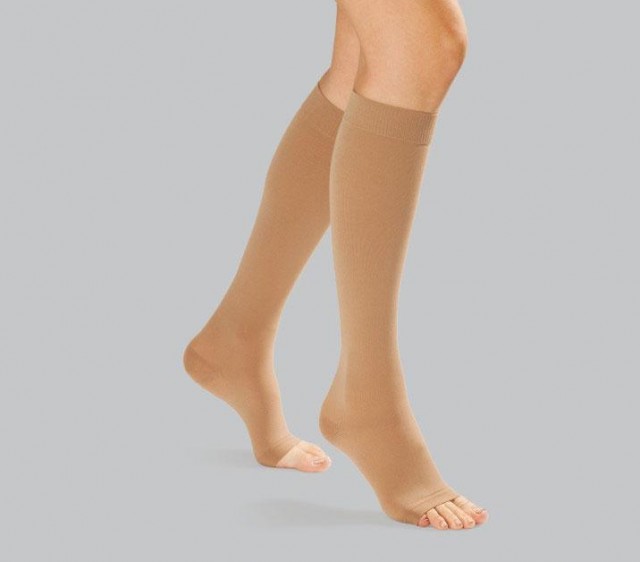 Τα ανοιχτά δάχτυλα επιτρέπουν καλύτερο αερισμό και μεγαλύτερη άνεση, ενώ διευκολύνουν τη χρήση σε ασθενείς με δερματικές ευαισθησίες ή τραυματισμούς στα δάχτυλα. Η διαβαθμισμένη συμπίεση Class I (17–22 mmHg) ασκεί τη μέγιστη πίεση στον αστράγαλο, μειώνοντάς την σταδιακά προς το γόνατο, ενισχύοντας έτσι την επιστροφή του αίματος προς την καρδιά.